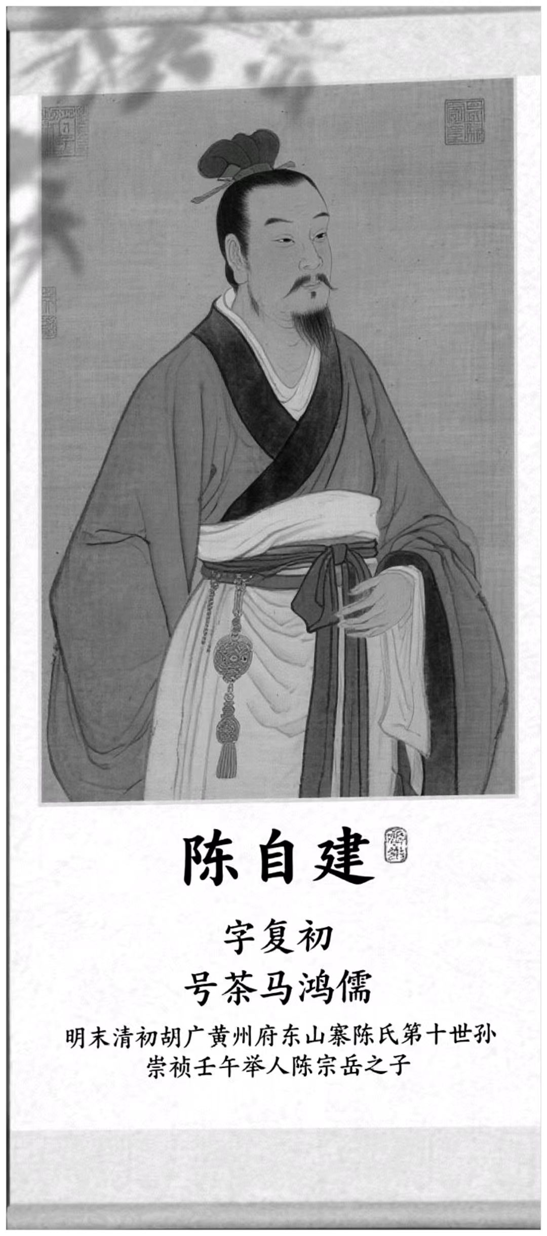 宗族档案人物志:”陈宗岳的遗腹子陈自建(公元1647-1730),在母亲朱氏含辛茹苦的抚养下长大。朱氏虽生活困苦,却始终以忠义之事教导儿子。临终之际,她将祖坟秘窖中藏有陈宗岳战刀与盟书的秘密告知陈自建,并嘱咐道:“若华夏复兴,可取出示人”。陈自建谨遵母训,投身茶马贸易,还独创“炭匣护茶”法,从商守节传家,凭借卓越的智慧与高尚的品德,被后世尊为“茶马鸿儒”于雍正八年在麻城无疾而终,葬于麻城东山。其子陈義莲、陈義辉继承父志,创立“忠义号”茶商号,陈儀莲公化名“廿七郎",陈儀辉公化名"廿八郎“在掩护前朝抗清守节的遗民运动中做出了巨大贡献,将商道化作义途,践行着家族的忠义精神。"
